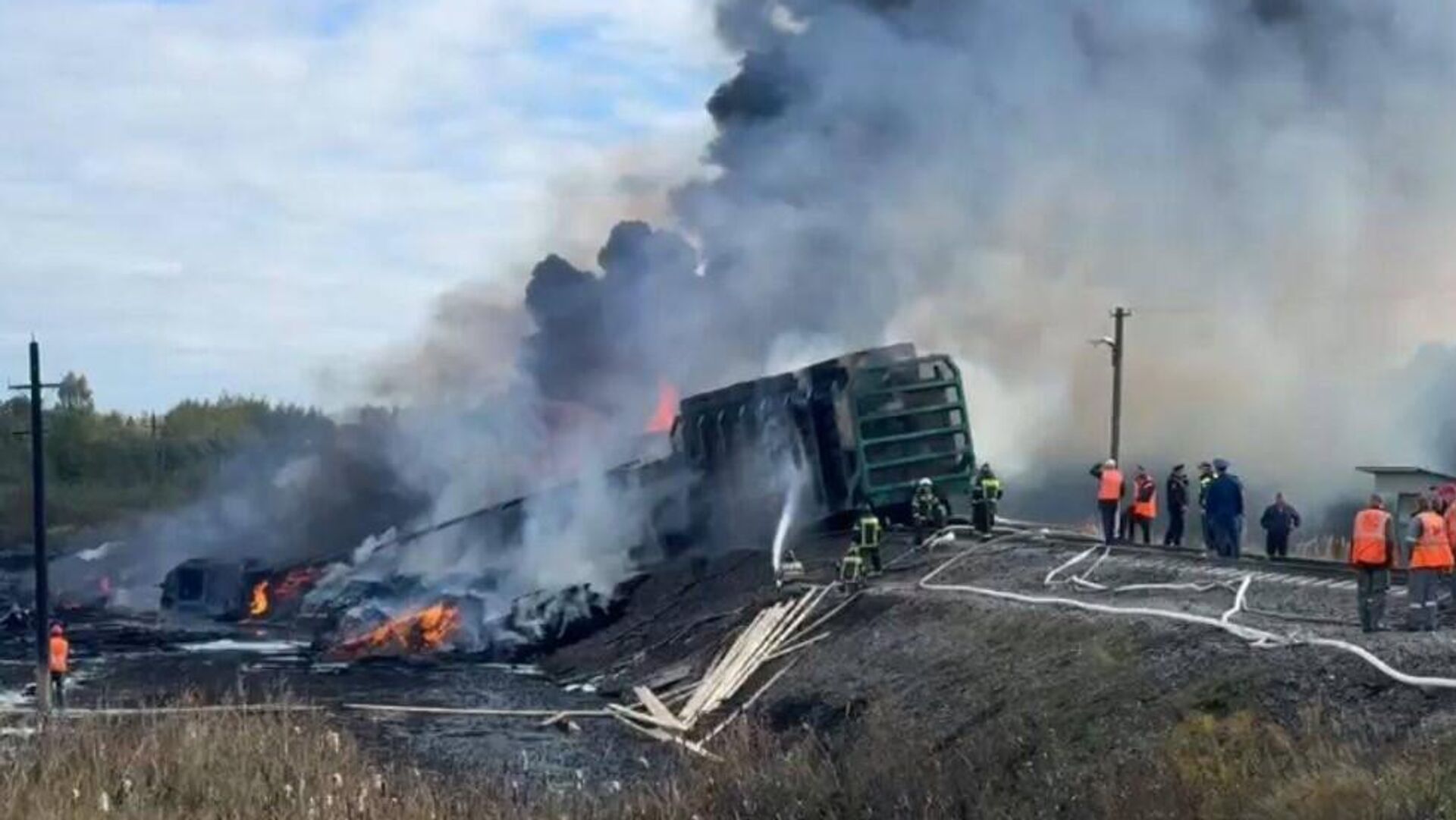 сообщалось, что восемнадцать вагонов с бензином сошли с рельсов из-за столкновения грузовика с товарным поездом на переезде в Смоленской области. Как сообщает пресс-служба Московской железной дороги, на месте происшествия начался пожар.